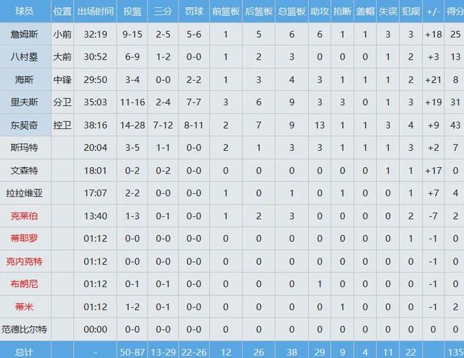 毫不客气地说,湖人三巨头绝对是当今联盟进攻火力最强悍的组合,此役合砍99分之多,东契奇43分9板13助超级准三双,里夫斯31分9板3助,詹姆斯25分6板6助。