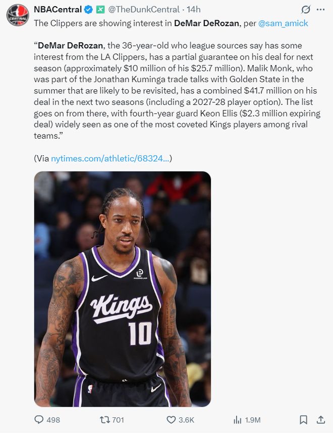 赛前TA记者萨姆-阿米克就报道,洛杉矶快船有意德罗赞,因为国王已经将德罗赞、拉文、小萨、蒙克等人摆上货架,甚至有传言说国王可能会裁掉德罗赞。