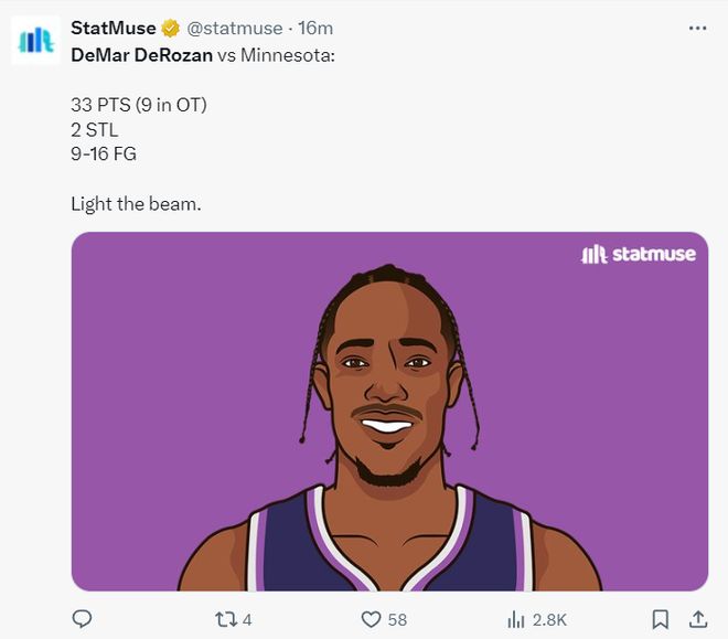 这场比赛还是德罗赞的里程碑之夜,他的总得分超过英格列什25613分升至NBA历史得分榜第24位。