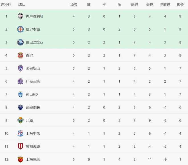 三场比赛结束之后,亚冠最新排名如下: